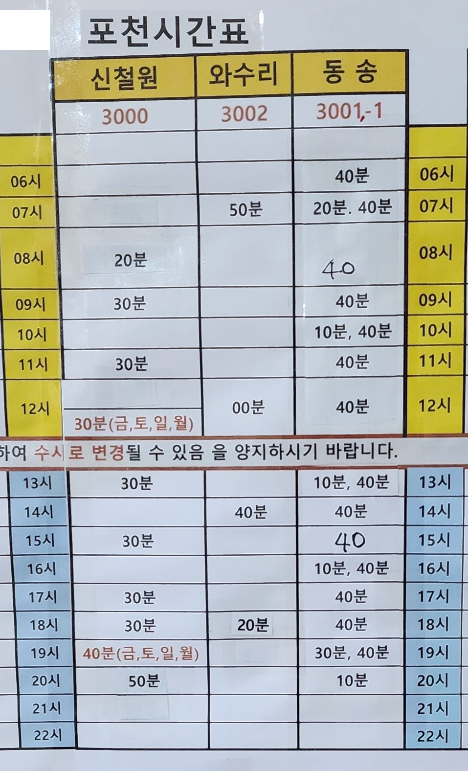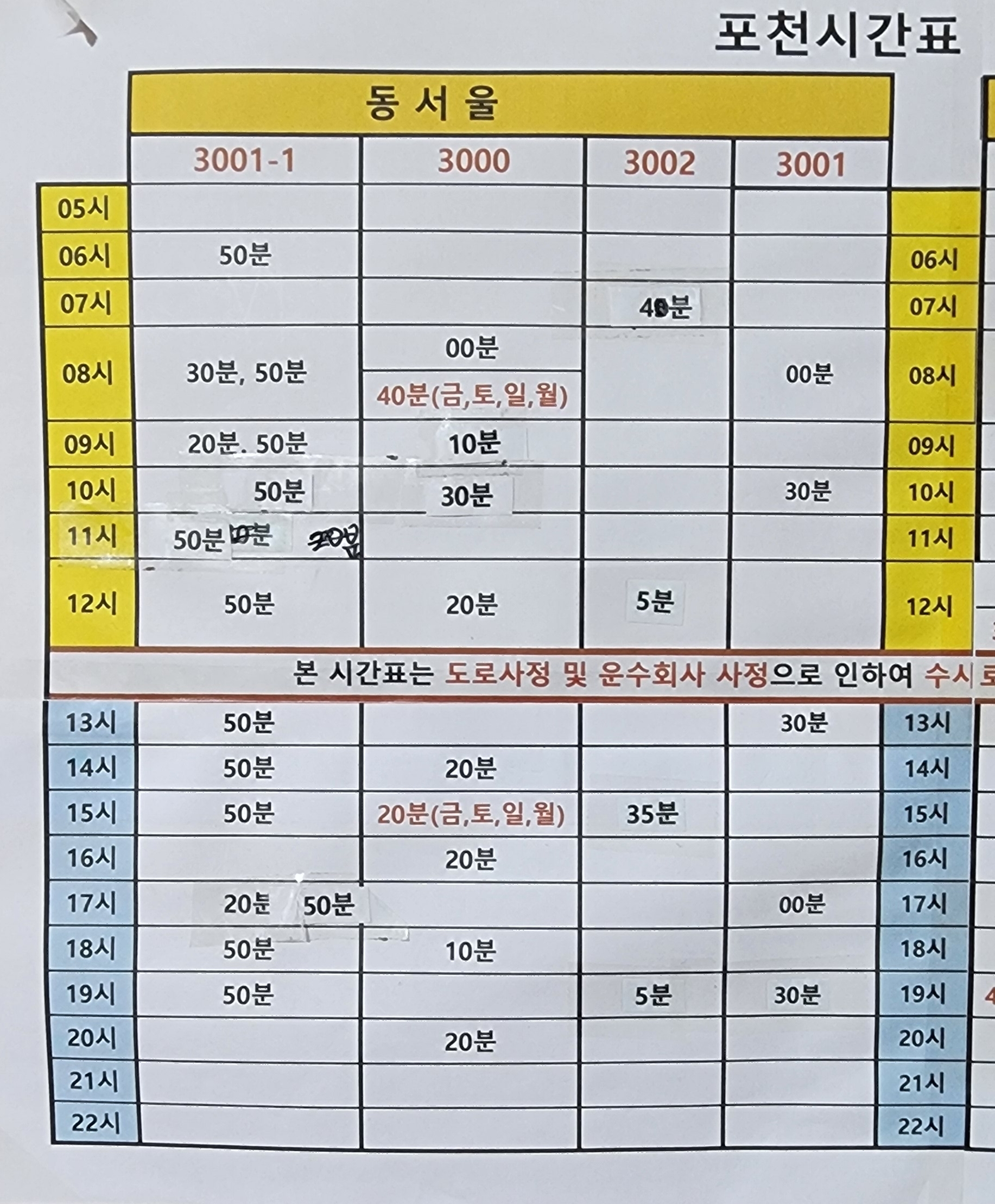 평일기준 시간표이지만 금, 토, 일, 월에만 운행하는 노선이 있으니 확인이 필요하다.
