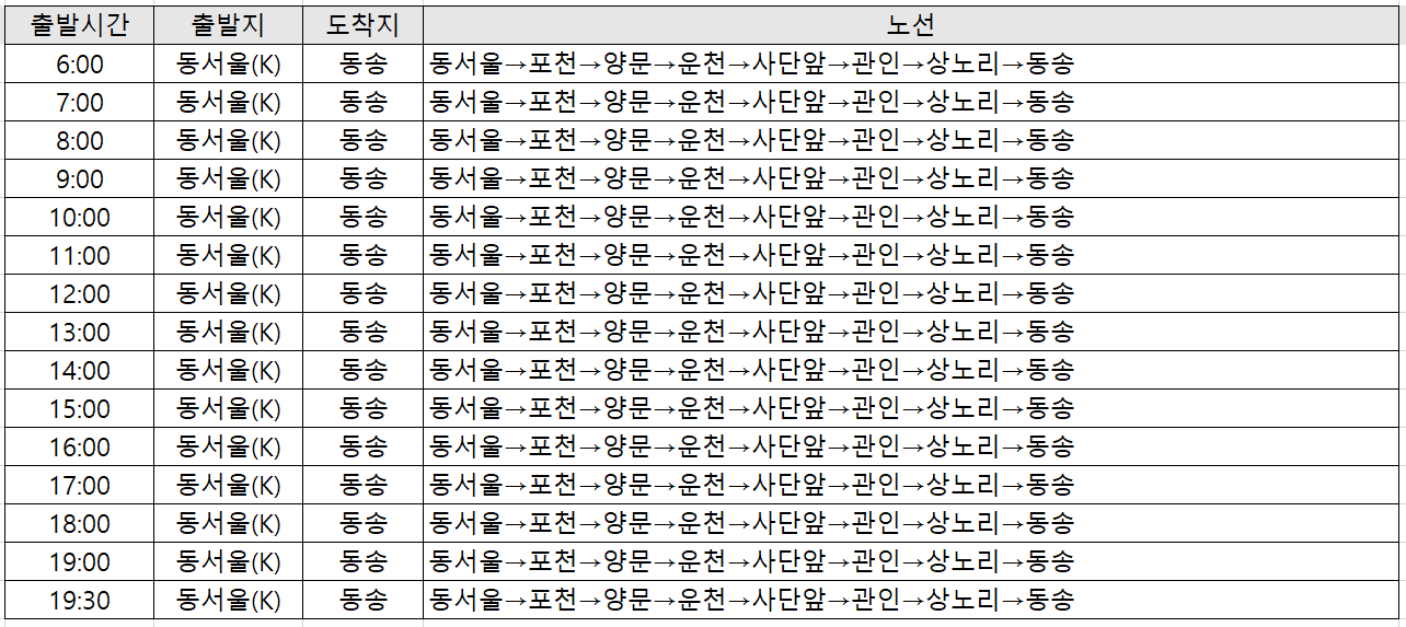 동송 출발 동서울행 시간표.