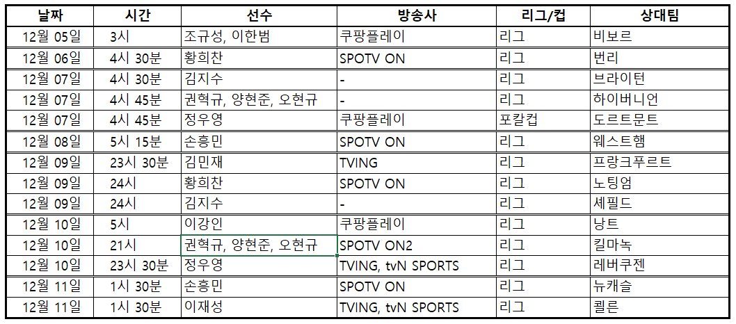 본 포스팅은 2023년 12월 4일부터 12월 10일까지의 유럽에서 활동중인 축구선수들의 소속팀 일정에 대한 글입니다. 한국 방송사에서 중계하는 선수들 기록한 것이니 참고하세요.