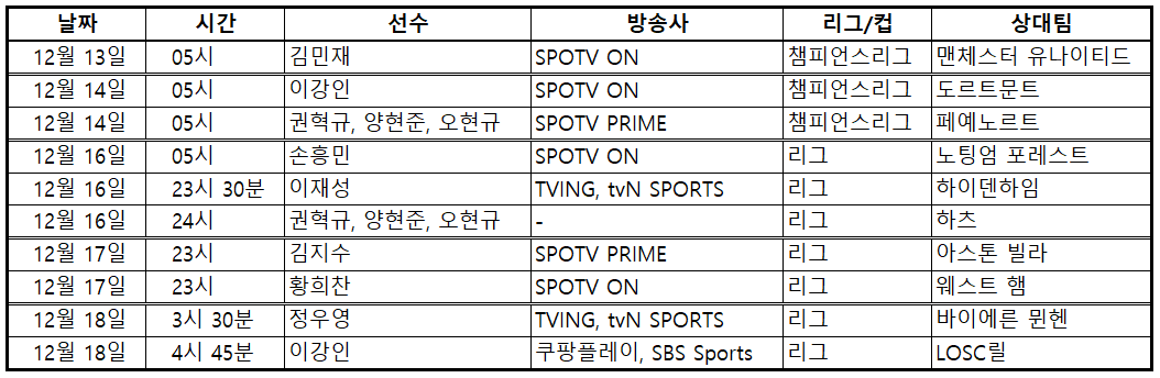 본 포스팅은 2023년 12월 11일부터 12월 17일까지의 유럽에서 활동중인 축구선수들의 소속팀 일정에 대한 글입니다. 한국 방송사에서 중계하는 선수들 기록한 것이니 참고하세요.
